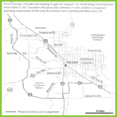 However, according to maps obtained by the ADI, Huckleberry is considering other plans. According to maps distributed as part of his sales pitch, one of Huckelberry’s ultimate goals appears to have a road in place where I-11 would eventually be built.