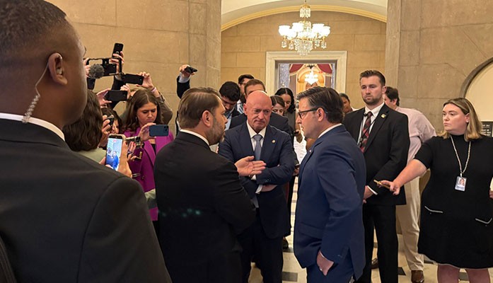 Witnesses says that Senators Mark Kelly and Ruben Gallego tried to host a publicity stunt outside of the Speaker’s Office. Speaker Mike Johnson turned the tables and came out to ask them to do their jobs and vote to reopen the government.