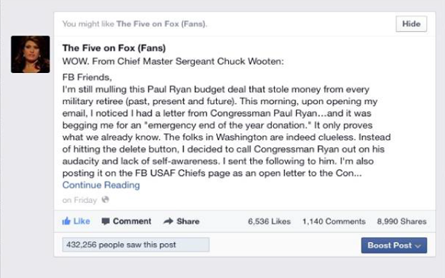 In his email, Ryan urged Wooten “to stand up one last time this year.” So that is what Wooten did. Wooten did not simply delete the message. He shared his response to Ryan’s plea on his Facebook page. That message was shared by 8,963 people and according to Five on Fox (Fans) page administrator, Sean O’Reilly, over 400,000 people have seen the post.