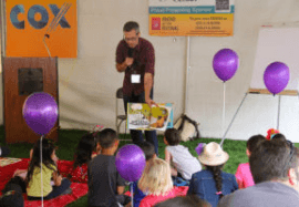 Adam Rex reads “The Legend of Rock Paper Scissors,” a book he illustrated, to a group of children at the Tucson Festival of Books. (Photo by: Gloria Knott/Arizona Sonora News Service)