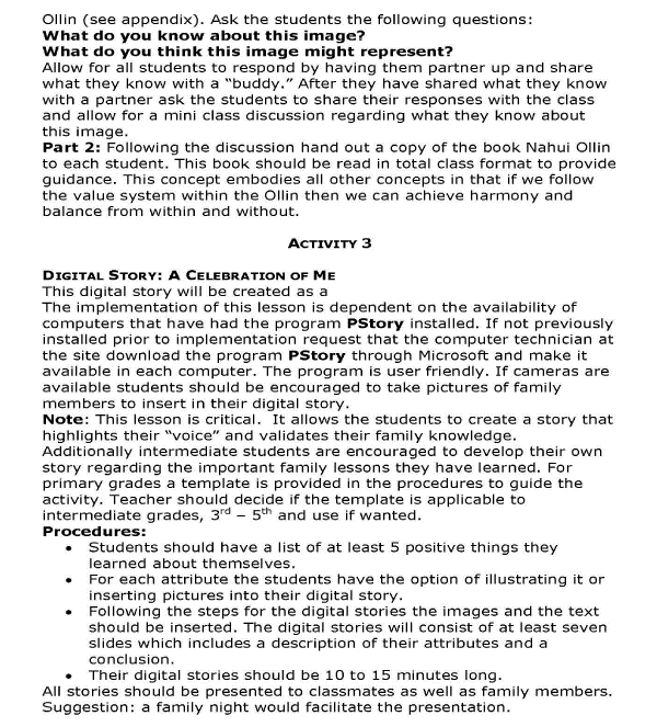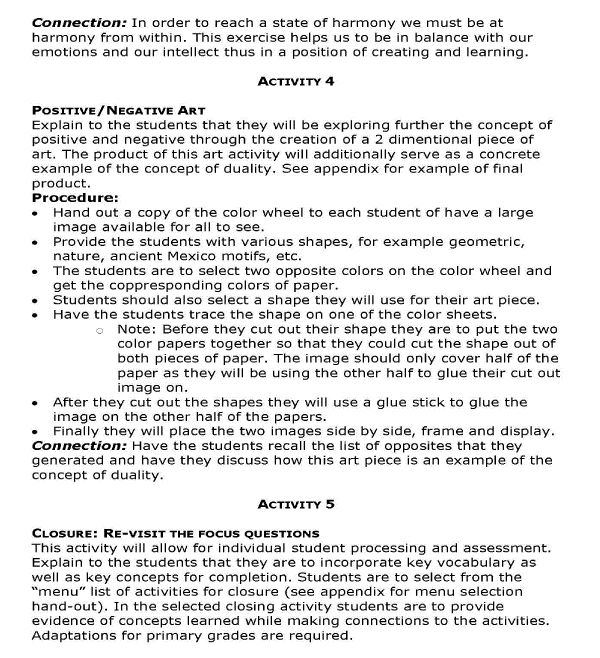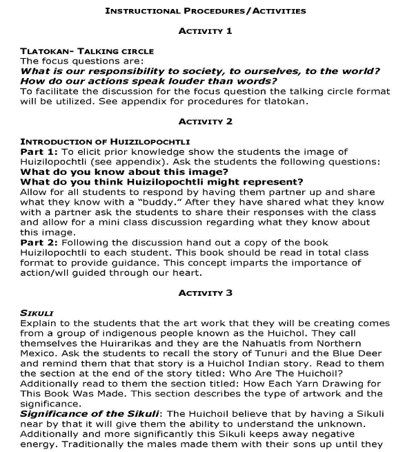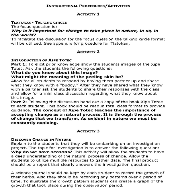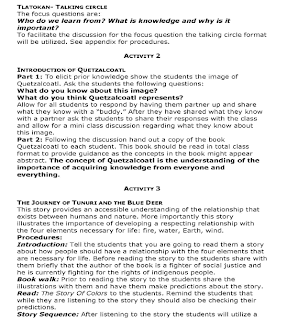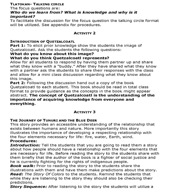 The plan’s developer, Norma Ballesteros writes that the plan is, “rooted in spirituality and indigenous knowledge and wisdom, this unit is centered on self-reflection in the context of appealing to the development of every aspect of a child: emotional, intellectual, physical and spiritual. Equally as important the unit was created to foster interdependence with nature thus introducing the need to have a relationship with it.”