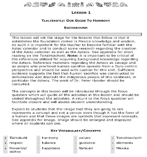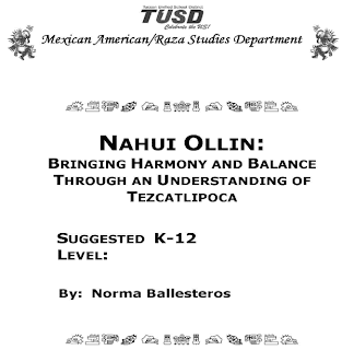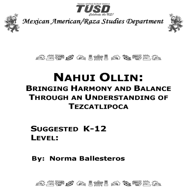 Nahui Ollin: Bringing Harmony and Balance Through an Understanding of Tezcatlipoca is a lesson plan offered through TUSD’s Mexican American Studies Department. The lessons underlying goal “guiding this unit is to begin to transform the negative impact of colonization and the tragic effects it has had on indigenous people of this continent for the past five hundred years.”