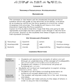 In her testimony in the appeal, TUSD teacher Julie Elvick Mejia, discussed at some length the importance of Aztec spirituality in her classroom. She testified that her students began their current school year with the “Four Sacred Elements to Becoming Human” as outlined in this lesson.