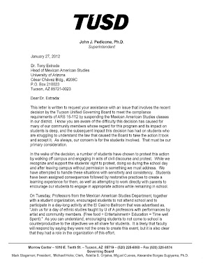Only after receiving a letter signed by over one hundred people demanding protection for students and an investigation into the exploitation of students did the district’s Superintendent John Pedicone write to Dr. Tony Estrada, the head of the Mexican American Studies Department at the University of Arizona. He requested Estrada’s assistance, noting that “Professors from the Mexican American Studies Department together with a student organization, encouraged students to not attend school and to participate in a day-long activity at the El Casino Ballroom, that was advertised as Join us for day of ethnic studies taught by U of A professors with performances by artist and commu8nity members. (Free food+Entertainment+Education=Time well Spent.)”