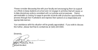 Pedicone admitted in his letter that “It is likely that faculty will respond by saying they were not the ones to create this event, buy it is also clear that they had a role in the organization of this effort. This is not the first time, the Superintendent has admitted that adults were behind the students’ actions. After the student takeover of a Governing Board meeting last Spring, the Superintendent wrote Governing Board member Judy Burns that the students were “well-meaning and manipulated.