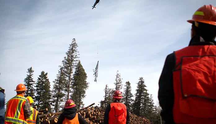 A constant whoosh from the chopper’s blades echoes against the mountainside as Webb’s crew flies back and forth, grabbing trees and dropping them at a landing area where the felled trees are trimmed and stacked.