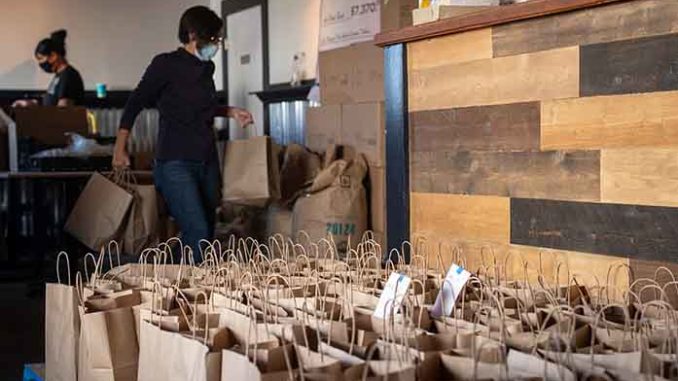 It’s just after 8 a.m. and the space already is filled with nearly a dozen workers and volunteers. The cafe used to house food incubator businesses, but those left early in the pandemic. Now, every spare surface is covered in food, ready to be given to families in need.