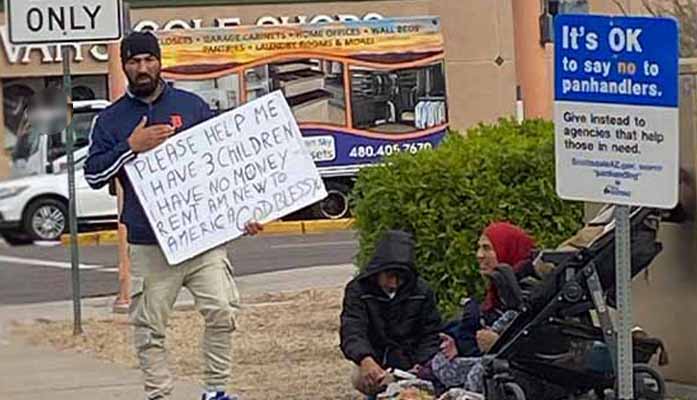 A panhandler, in north Scottsdale this week, held a sign advising drivers that he and his family are “new to America” and have “no money for rent.”