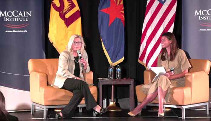 Congresswoman Liz Cheney traveled to Arizona on Wednesday to stump for Secretary of State Katie Hobbs at an Arizona State University event sponsored by the McCain Institute. While the event was part of the Knight Foundation-funded “Defending American Democracy Program,” Cheney spent the bulk of her time complaining about the results of democratically held elections.