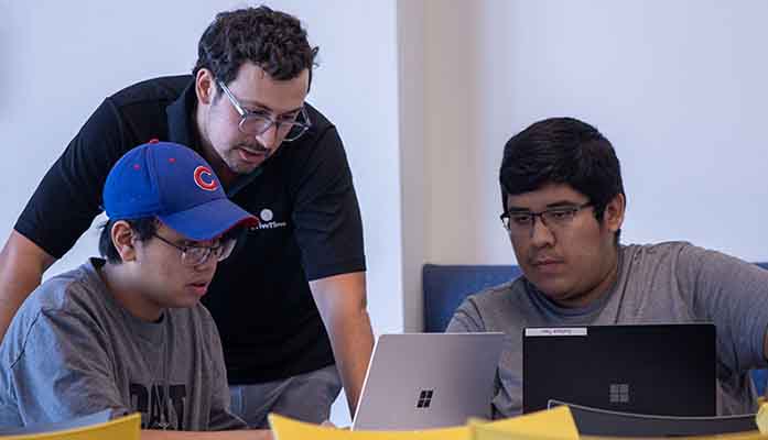 Katica Calderon, 14, left, and program mentor Matt Abrigo, a senior data analyst for DriveTime, troubleshoot an issue on Microsoft Azure in the Mark Cuban Foundation AI Boot Camp. (Photo by Justin Spangenthal/Cronkite News)