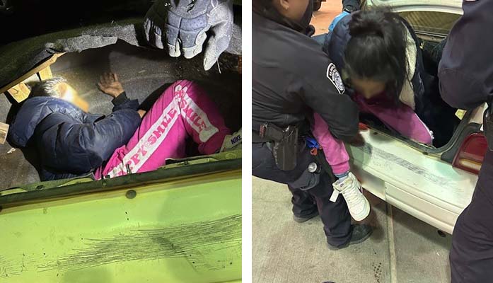 During the secondary inspection, CBP officers noticed the trunk of the vehicle appeared to be abnormally elevated. Upon further examination, officers raised the carpet of the trunk area and discovered a person hidden inside the spare tire well. CBP officers assisted a female out of the compartment. The female, a 29-year-old Mexican citizen, did not possess valid entry documents.