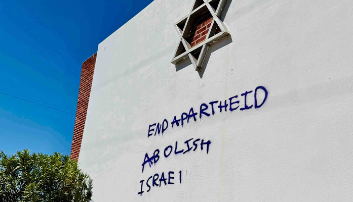 A shul in Tucson was vandalized on Tuesday; the perpetrator(s) wrote the phrases “End Apartheid” and “Abolish Israel.”