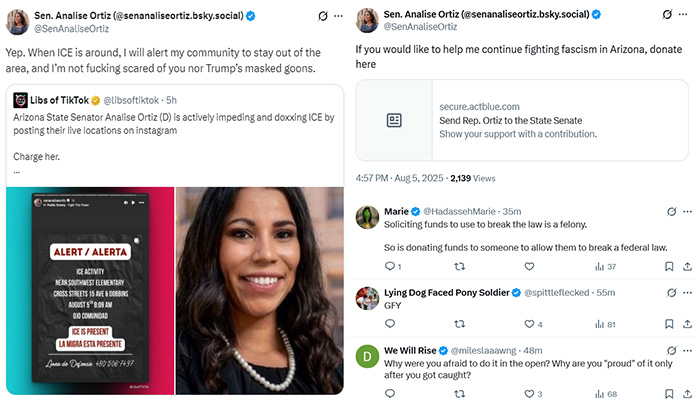 Arizona State Senator Analise Ortiz (D) is actively impeding and doxxing ICE by posting their live locations on instagram