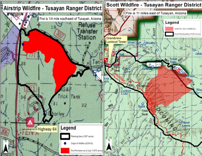 Crews working on the Scott and Airstrip wildfires on the Tusayan Ranger District of the Kaibab National Forest are making steady progress