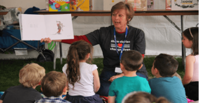 A group of children join together for story time at the Tent for Tots booth at the Tucson Festival of Books. (Photo by: Gloria Knott/Arizona Sonora News Service)