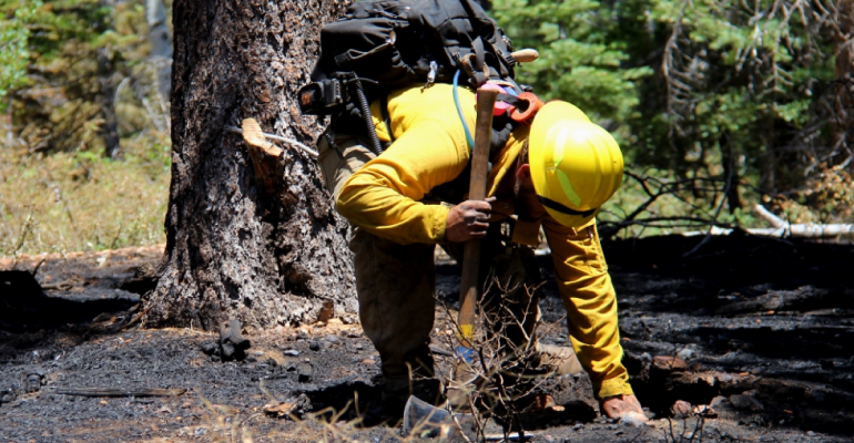 Photo Caption: Cold trailing the fire, checking for hotspots. Photo Credit: NPS