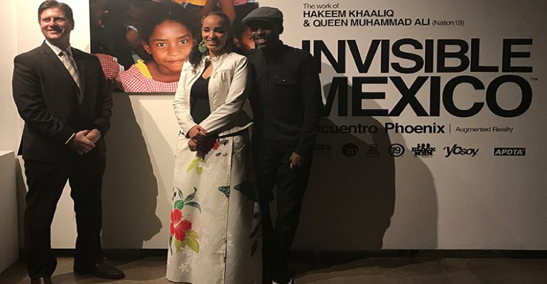 Phoenix Mayor Greg Stanton (left) poses with “Invisible Mexico” artists Queen Muhammad Ali and Hakeem Khaaliq for the opening night of the exhibition on Thursday, March 2, 2017. (Photo by Ryan Santistevan/Cronkite News)